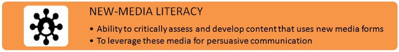 New-Media Literacy: Our social life is dominated by user generated content which is visually rich. Therefore, the ability to fluently understand the rich media content such as videos, animations would be a key skill per se. The ability to use and understand immersive and visually stimulating presentation of information would be a key aspect.