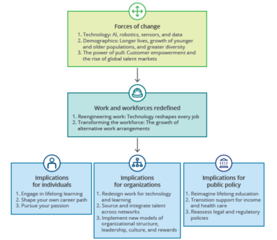As described earlier, the set of forces that are majorly impacting the future of jobs can be classified in three groups: